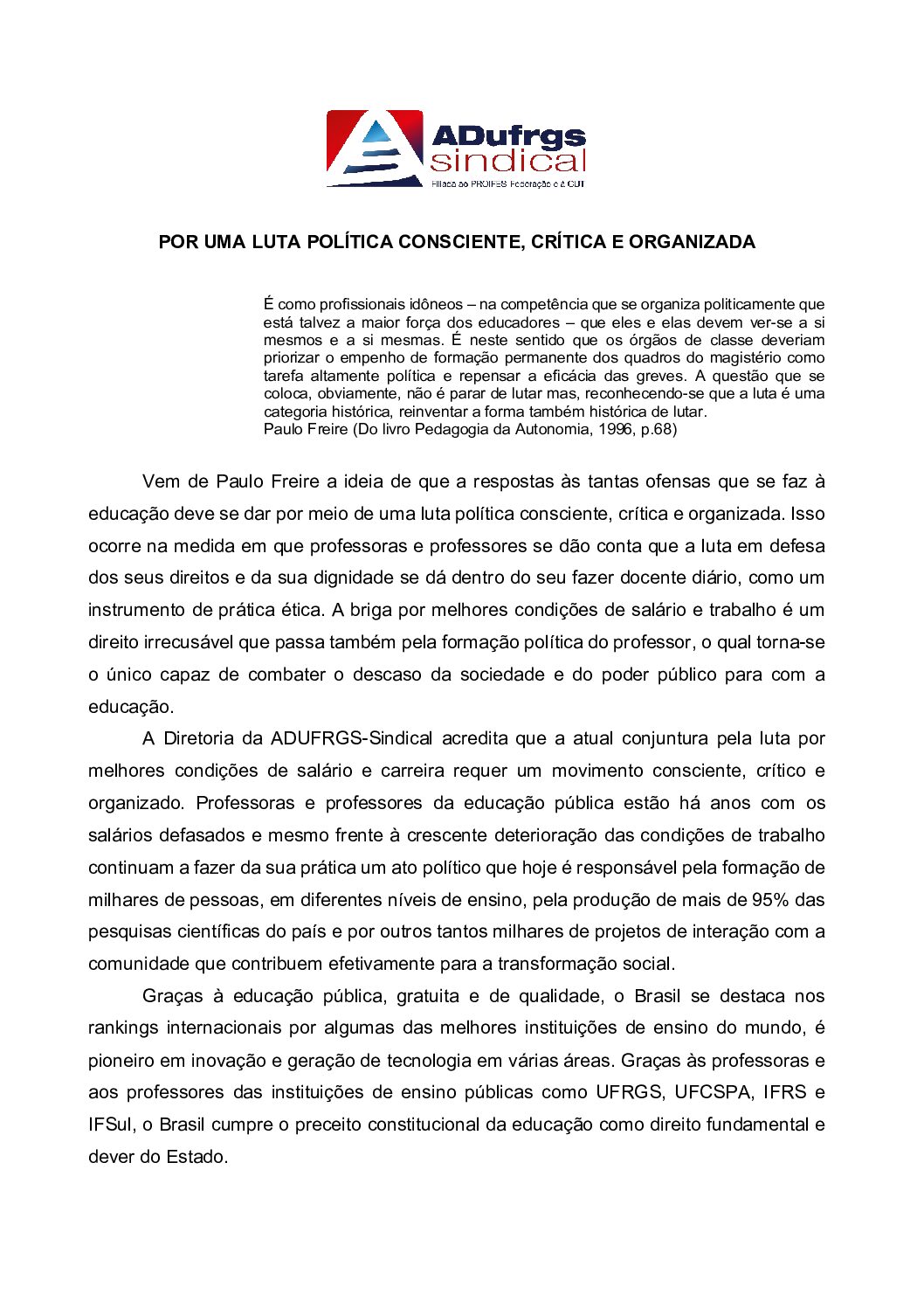 Esta edição aborda, por meio de notícias e artigos, temas como a falta de infraestrutura nos campi da UFRGS, o reconhecimento da Justiça e da PGR da ADUFRGS como o único sindicato de Porto Alegre, a assembleia que decidiu manter negociações e mobilização sem indicativo de greve e PROIFES-Federação realiza reunião do Conselho Deliberativo e orienta sindicatos a realizar assembleias.